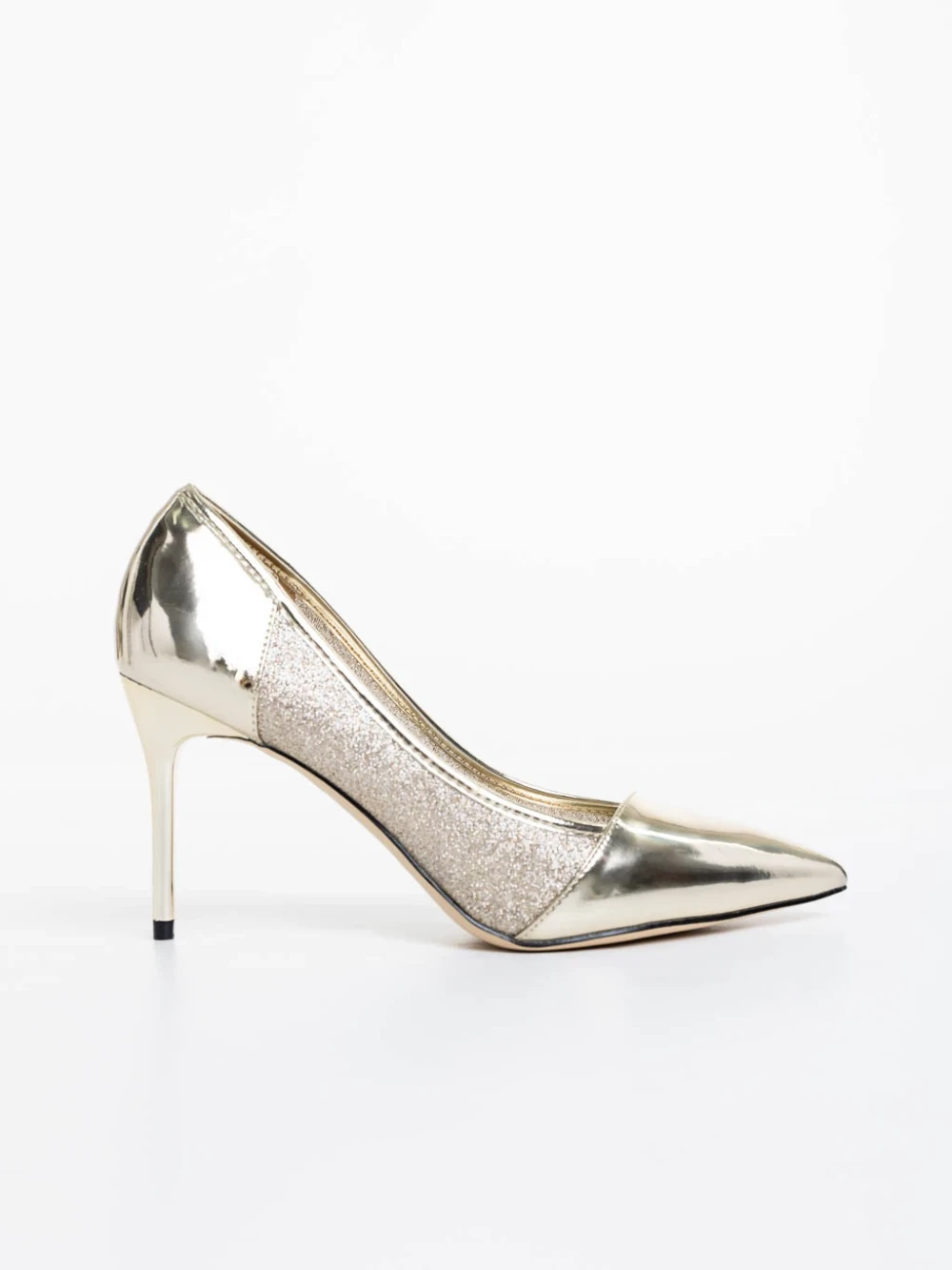 Дамски обувки с ток златисти от екологична кожа и текстилен материал Tanishka