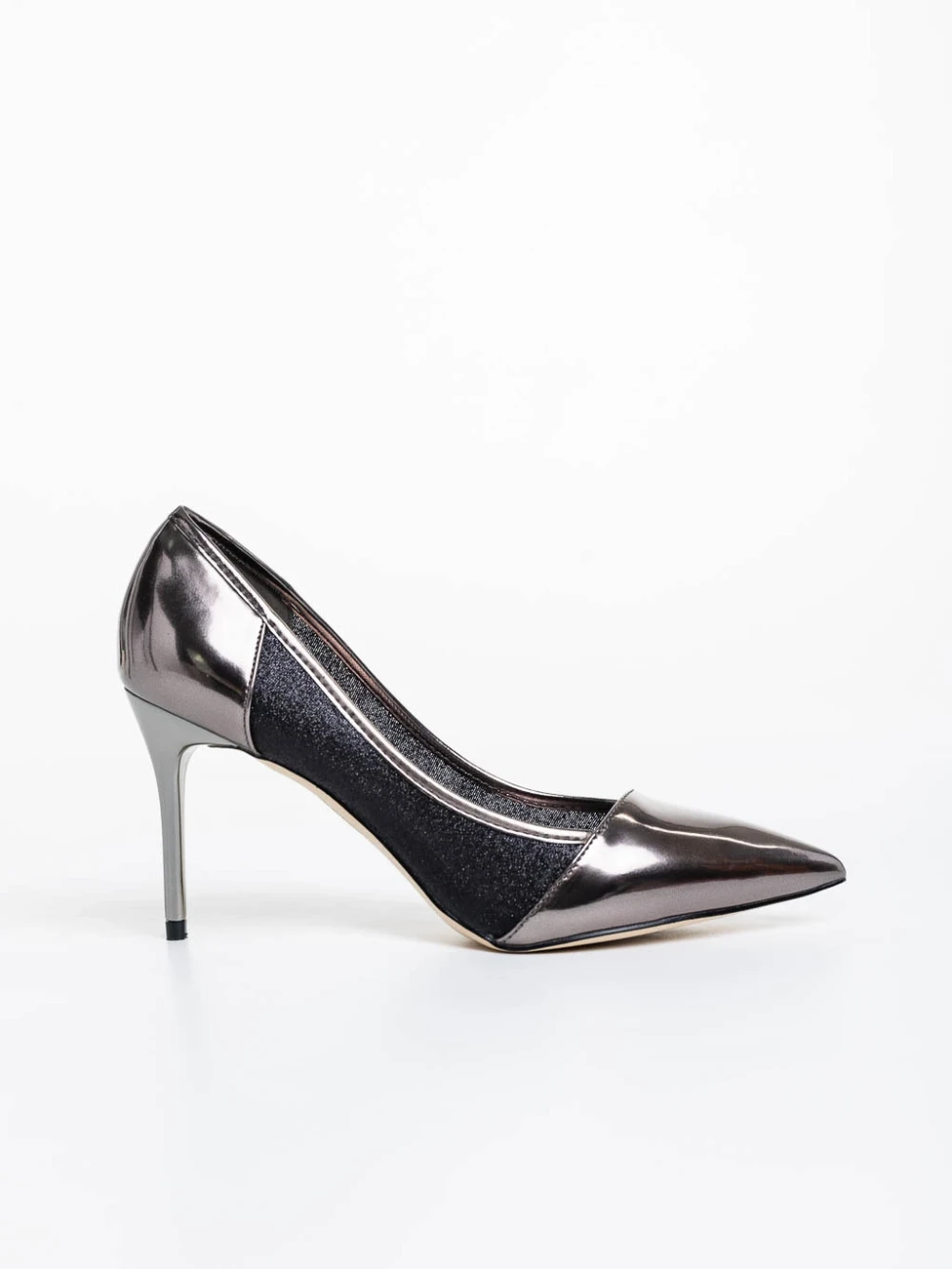 Дамски обувки с ток тъмносребристи от екологична кожа и текстилен материал Tanishka