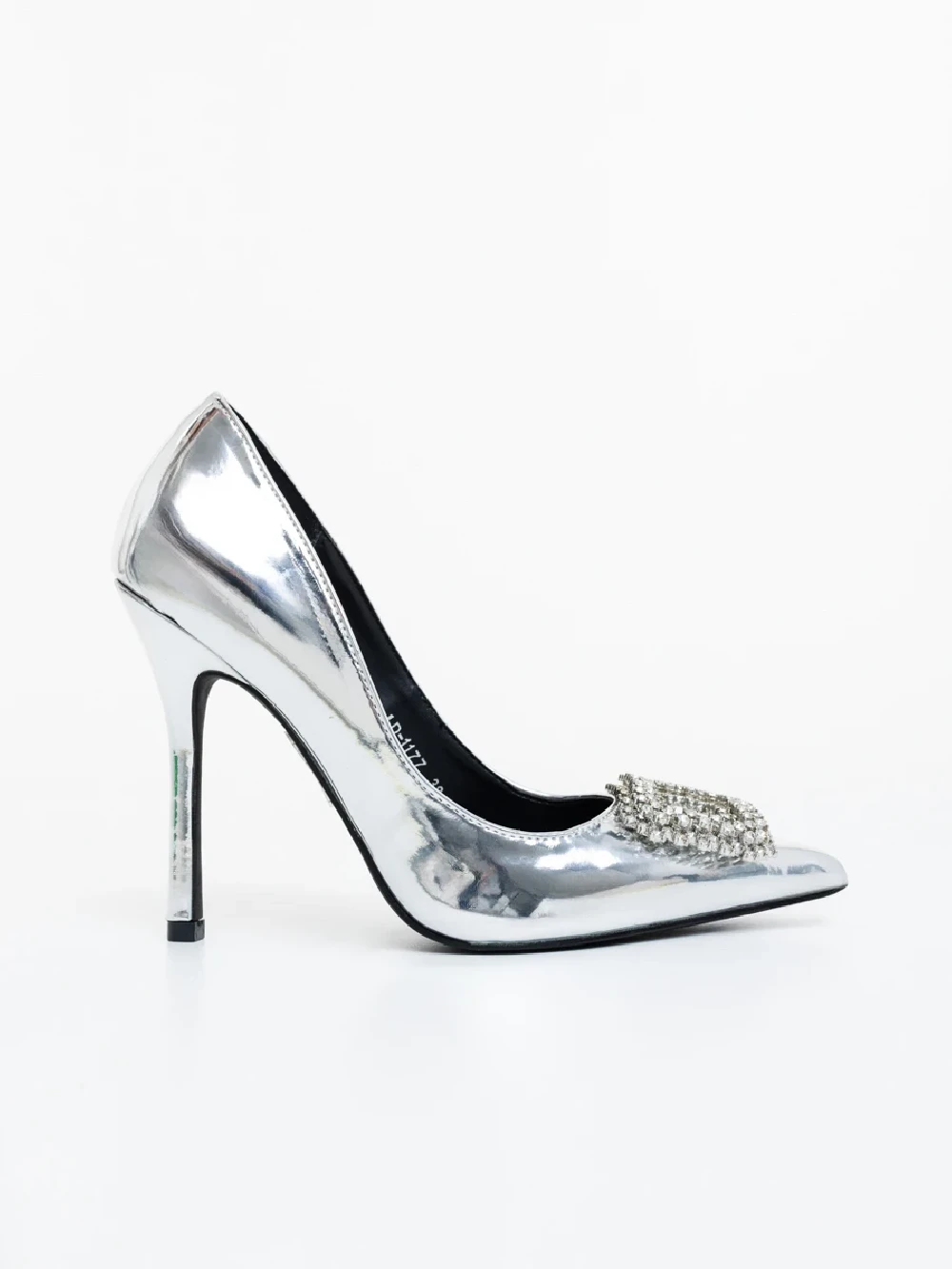 Дамски обувки с ток сребристи от екологична лачена кожа Lusera