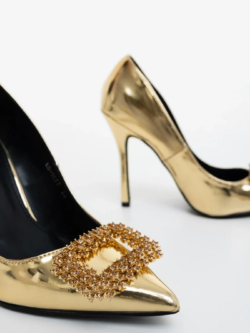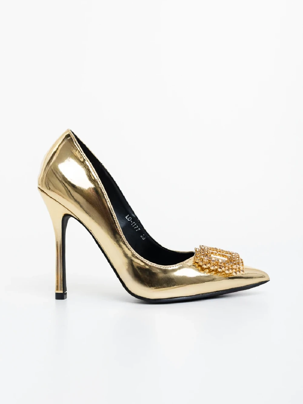 Дамски обувки с ток златисти от екологична лачена кожа Lusera